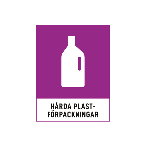 Hårda plastförpackningar, som burkar och flaskor, kan återvinnas och bli nya produkter när de sorteras rätt. Dekalen Hårda plastförpackningar visar enkelt var dessa ska lämnas, vilket gör sorteringen enkel och miljövänlig. Används tex av återvinningsstationer, kontor, butiker och arbetsplatser. Med tydlig märkning blir hanteringen trygg, smidig och hållbar.