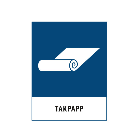Takpapp hör hemma i byggavfall och ska hanteras korrekt för att kunna återvinnas eller tas om hand på ett miljövänligt sätt. Dekalen Takpapp visar på ett enkelt sätt var takpapp ska placeras, vilket gör sorteringen enkel och arbetsplatsen organiserad. Kan tex användas på byggarbetsplatser, återvinningsstationer och lager. Med tydlig märkning blir hanteringen smidig, säker och hållbar.