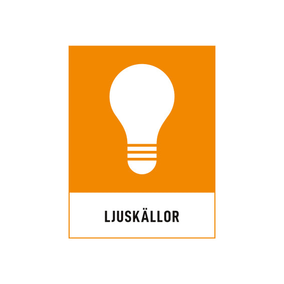 Gamla ljuskällor, som glödlampor, LED-lampor och halogenlampor, kan återvinnas istället för att slängas bland restavfall. Skylten för ljuskällor visar var produkterna ska lämnas och är lämplig för bostadsområden, arbetsplatser och återvinningsstationer. När ljuskällorna tas om hand på rätt sätt kan glas, metaller och elektronikkomponenter återvinnas, vilket bidrar till hållbar resurshantering och minskar miljöpåverkan.
