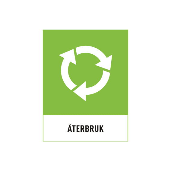 Återbruk handlar om att ge gamla saker en ny chans istället för att slänga dem. Denna dekal Återbruk, visar enkelt var material och föremål för återbruk ska placeras, vilket gör det lätt att sortera och bidra till en mer hållbar framtid. Perfekt för återvinningsstationer, skolor, företag och arbetsplatser. Med tydlig märkning blir återbruket smidigt, organiserat och miljövänligt.