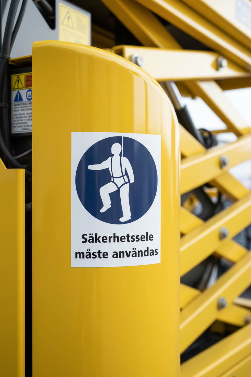 En självhäftande påbudsdekal med texten Säkerhetssele måste användas. Visar tydligt att säkerhetssele alltid ska användas i arbetsområdet. Perfekt för byggarbetsplatser, industri, underhåll och andra miljöer där arbete på höjd utförs.
