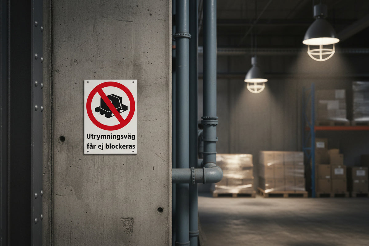 Denna Utrymningsväg-skylt används för att tydligt markera nödutgångar och vägar som ska hållas fria för evakuering. Skylten passar för kontor, skolor, offentliga byggnader, industrier och andra lokaler, både inomhus och utomhus.